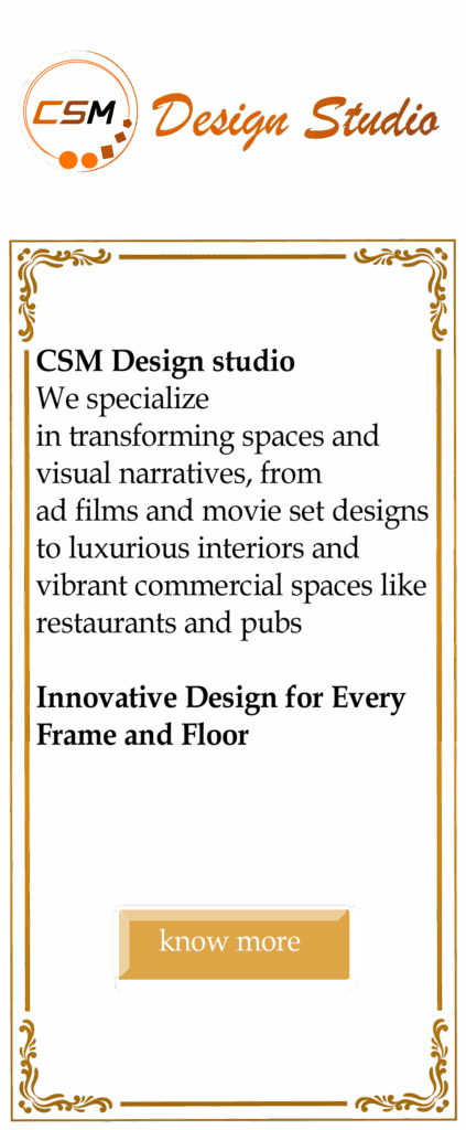 At CSM Design Studio, we specialize in transforming spaces and visual narratives. From ad films and movie set designs to luxurious interiors and vibrant commercial spaces like restaurants and pubs, our work speaks of versatility and vision.