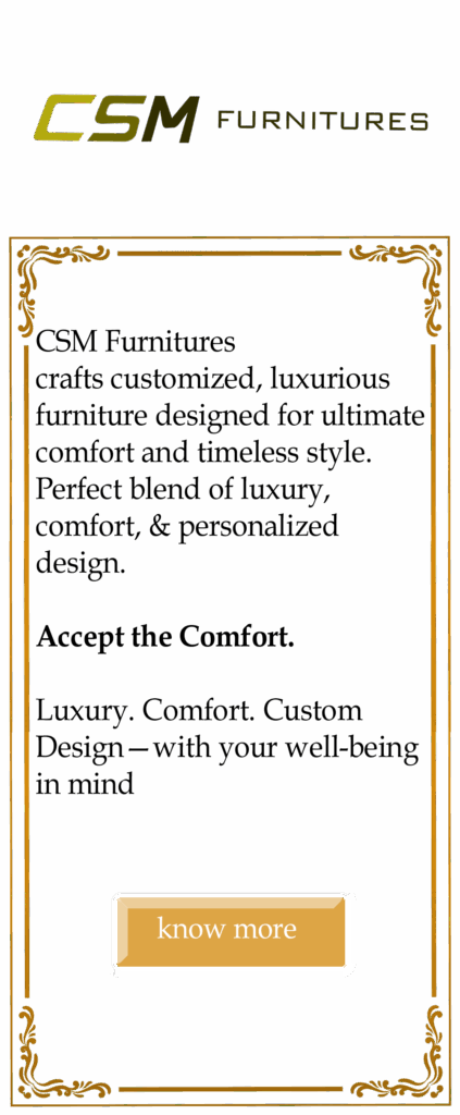 CSM Furnitures is a division of CSM Groups, the parent company renowned for its excellence in design and innovation. At CSM Furnitures, we specialize in crafting luxury furniture and custom-designed pieces that blend elegance, comfort, and functionality. Each creation reflects our commitment to superior craftsmanship, premium materials, and timeless style — designed to elevate residential, commercial, and hospitality spaces. Whether it’s bespoke interiors or statement furniture collections, CSM Furnitures transforms every concept into a masterpiece that defines refined living.