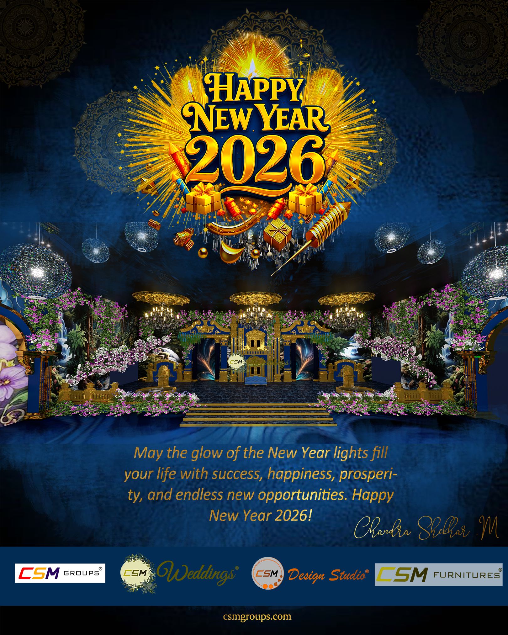 The Founder of CSM Groups, Chandra shekhar M an visual artist and independent architectural designer with extensive experience in interior design, experiential spaces, and large-scale event environments. His creative journey spans multiple disciplines, including custom wedding décor and planning, high-end event management, corporate experiences, and spatial design—allowing him to seamlessly blend artistic vision with functional execution.One of his most notable career milestones includes contributing to the iconic Anant Ambani–Radhika Merchant wedding, widely regarded as a billion-dollar Indian wedding extravaganza. He has also designed sets and led creative campaigns for major advertising projects such as Gulf Lubricants featuring MS Dhoni, Gillette Japan, and Cycle Pure Agarbatti. For Cycle Pure Agarbatti, he independently conceptualized the campaign end-to-end, designed and built miniature sets, and directed the complete stop-motion shoot, shaping the visual narrative from ideation to final execution.His portfolio further extends into television and live entertainment, including Malayalam Bigg Boss, Venky’s New Year Event, and the Dadasaheb Phalke Award ceremonies. Beyond events, his work includes designing immersive environments for Marathi dance shows, bike showrooms for Europe, custom furniture, as well as multiple hotels and restaurants—each project crafted to reflect a strong identity and immersive experience.In the private and corporate events space, he has curated exclusive celebrations and large-scale functions, including the grand wedding of Prakash Dhariwal’s daughter from the Rasiklal Manikchand Dhariwal family.